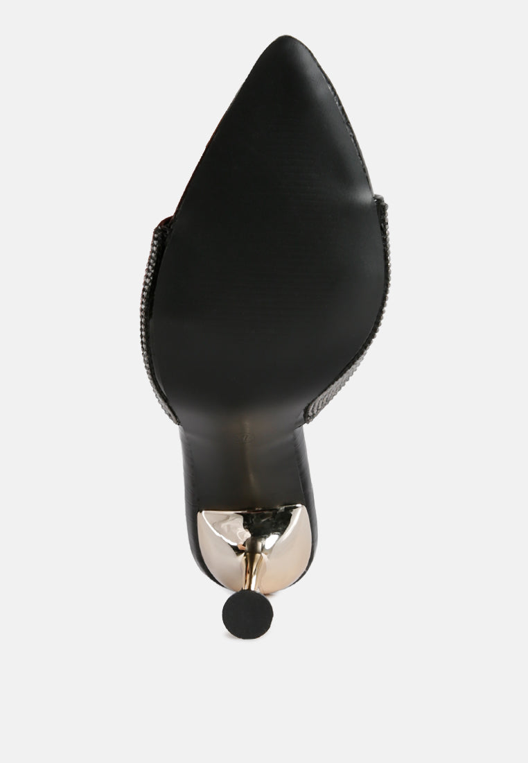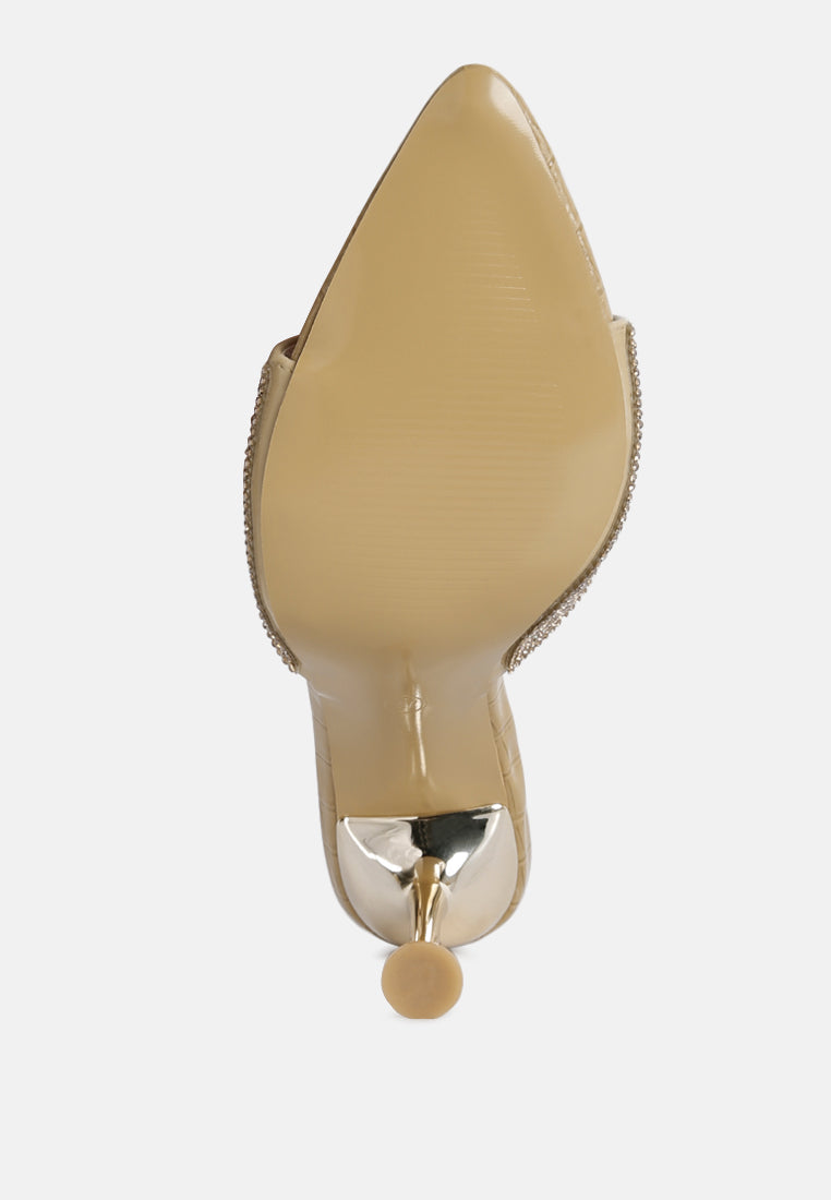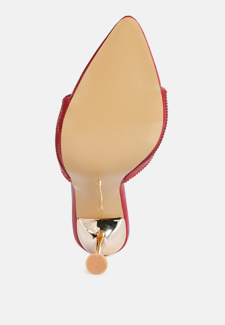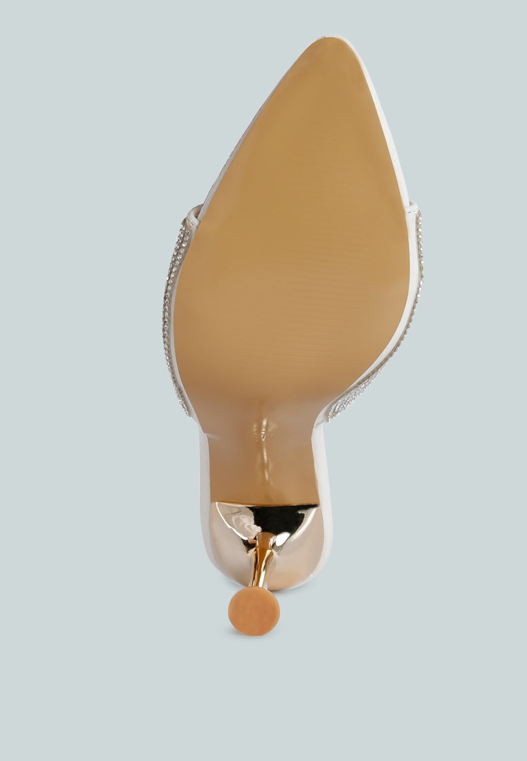 The rhinestone embellishments on these stiletto sandals make them look classy and stunning. The slip-on stiletto heels are perfect as bridal shoes, wedding guest shoes, bridesmaid shoes, and literally every occasion!