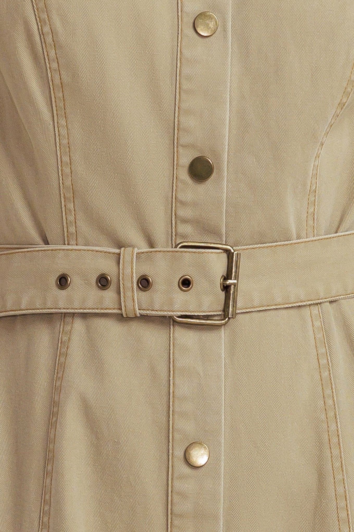 A solid woven midi dress featuring collar, short sleeve, button down, self belt and circle skirt