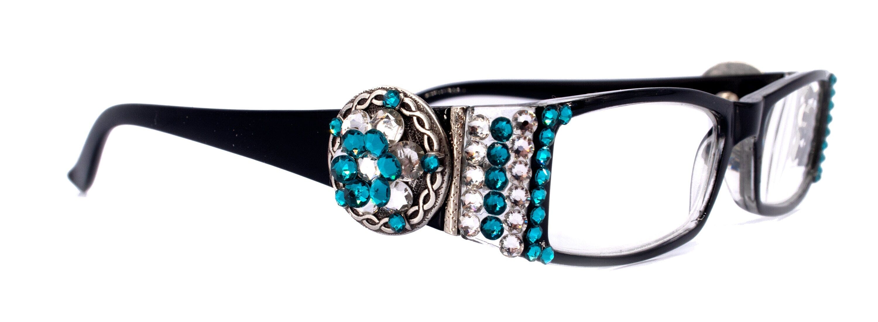 The Medallion, (Bling) Women Reading Glasses W (Blue Zircon, Clear) Genuine European Crystals Barbed wire Western Concho NY Fifth Avenue