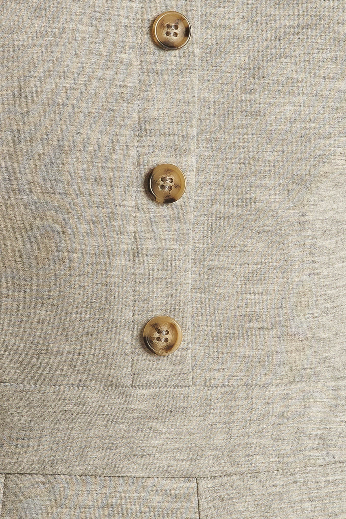A solid heather grey knit jumpsuit featuring straight neckline with straps, button front detail, side pockets, wide leg and back zipper closure