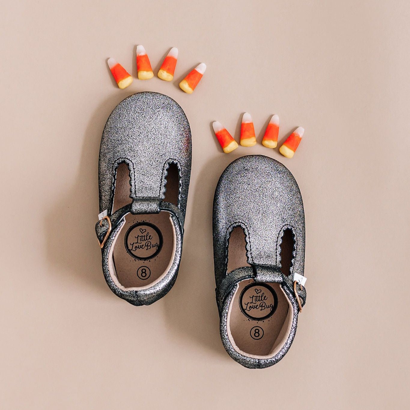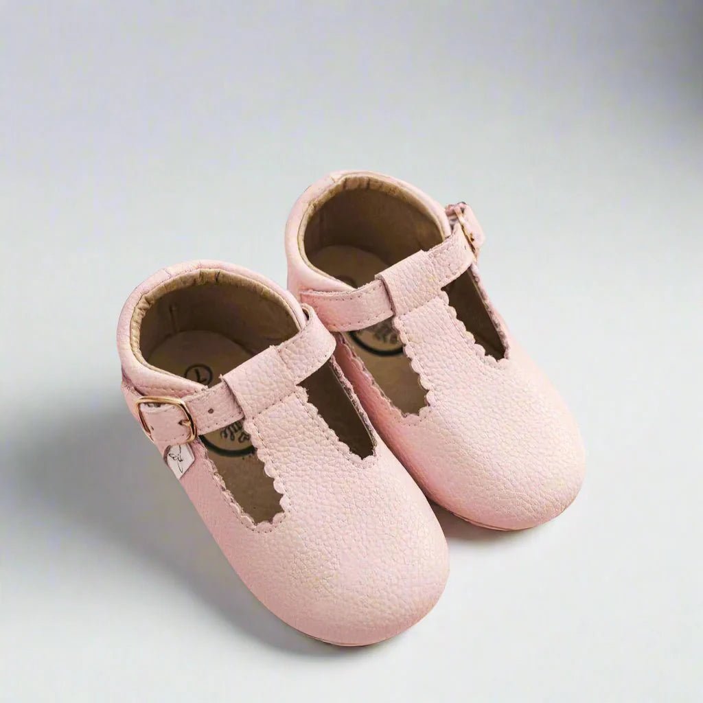 Little Love Bug Company's T Bars blend style and support for your child’s developing feet. These Montessori-approved scalloped shoes feature an elastic entrance and adjustable buckle for easy on and off.