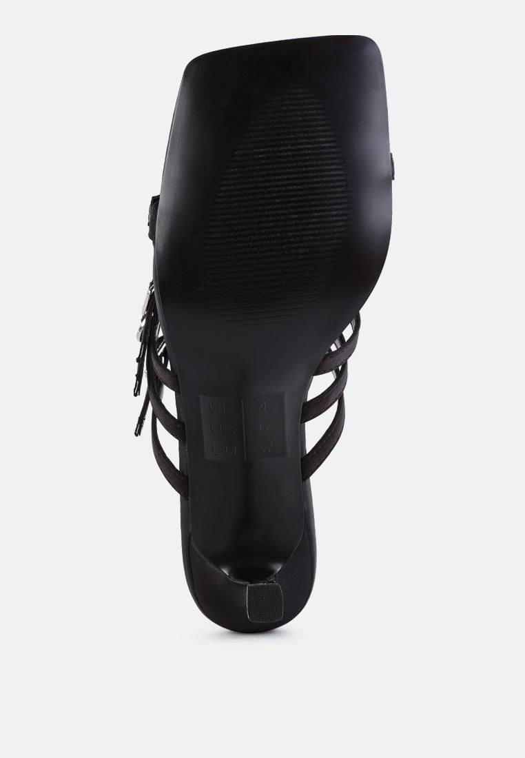 Timeless classic and beauty is captured perfectly in these open sqaure toe satin heels. With their unconventional multi strap detail and rhinestone embellished pin buckle detail; it's hard to resist wearing them all the time.
