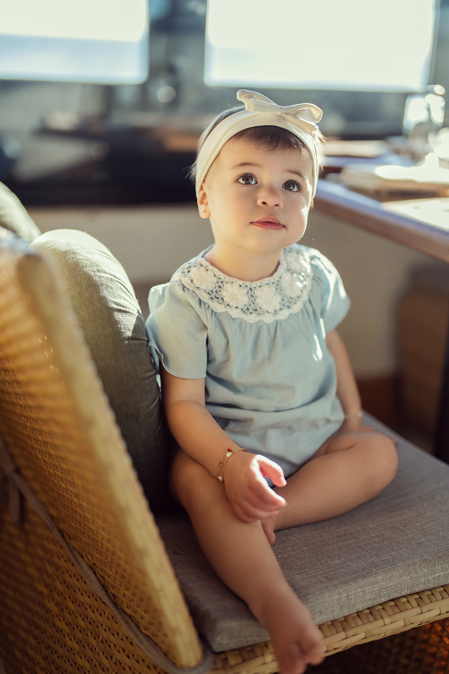 Baby girls woven cotton bubble with floral knit crochet collar, center back button opening and snap closure at bottom. ֲ